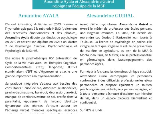 Deux nouvelles psychologues à la MSP ! Amandine Ayala, praticienne ICV et Alexandrine Guiral, spécialisée en psychopathologie du travail.